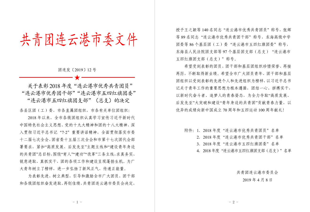 近日,共青團連云港市委員會公布了2018年度“連云港市優秀共青團員”“連云港市優秀團干部”“連云港市五四紅旗團委”“連云港市五四紅旗團支部”(總支)名單,我公司員工李筠涵榜上有名,被授予“連云港市優秀共青團員”稱號。