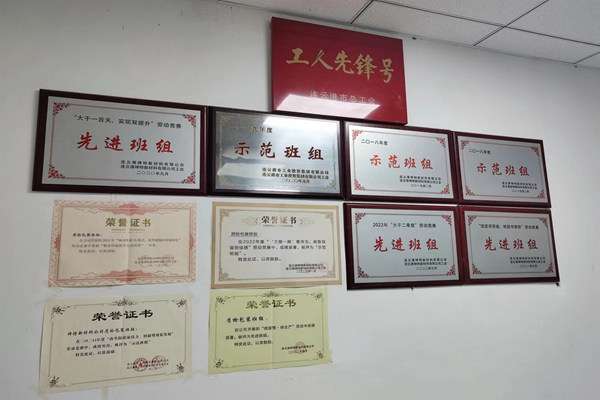 走進(jìn)質(zhì)檢辦公室,首先映入眼簾的就是這面榮譽(yù)墻,上面有近年來集團(tuán)頒發(fā)的“示范班組”和公司授予的各種榮譽(yù),還有一塊金字招牌,就是市總工會頒發(fā)的“工人先鋒號”。